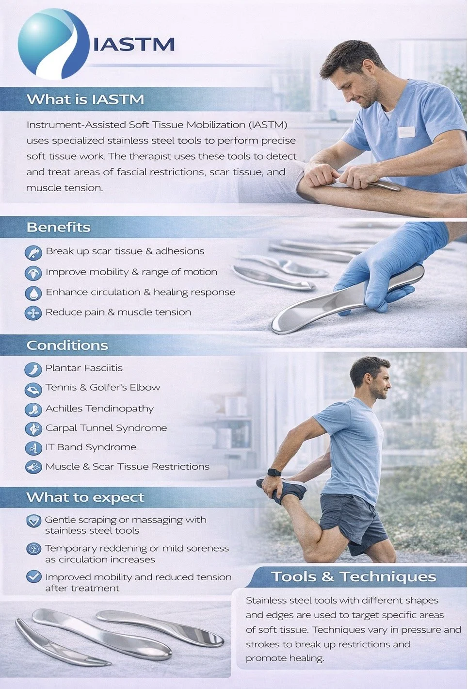 Graston Technique is a soft tissue mobilization technique that uses stainless steel instruments to break down scar tissue and fascial restrictions.