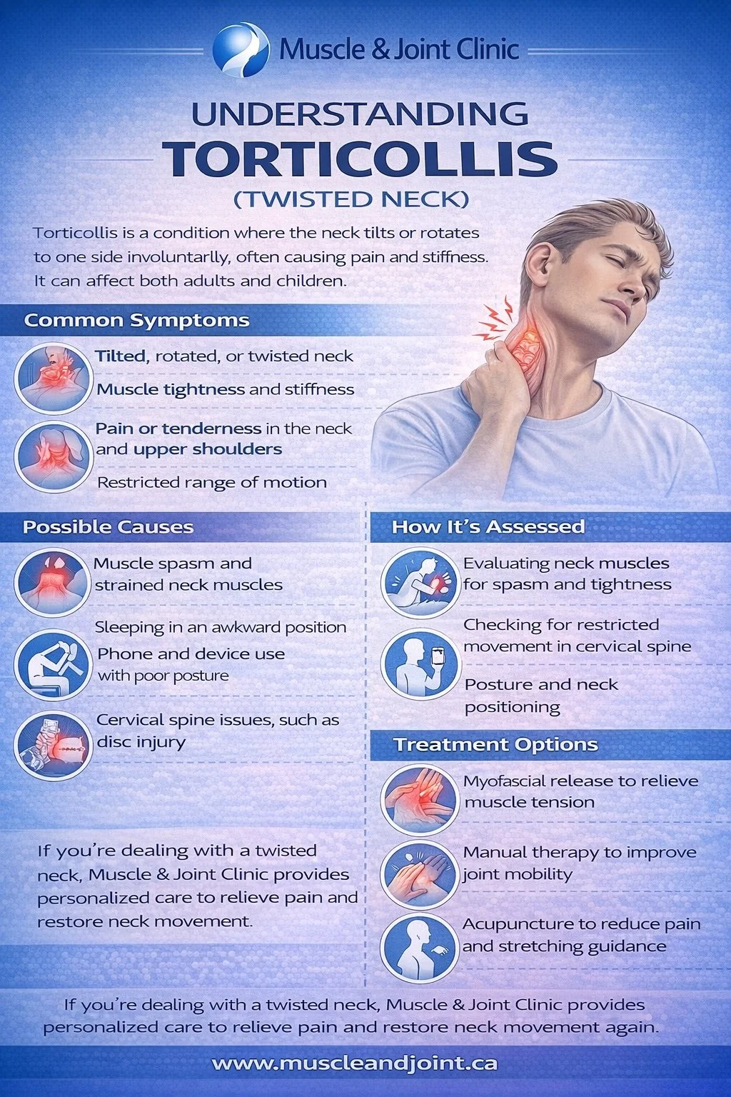 At Muscle & Joint Clinic, we provide personalized care for neck pain and conditions such as torticollis. Our team works to identify the muscles, joints, and movement issues contributing to your symptoms so that treatment can be targeted to the root of the problem. Whether your torticollis is related to muscle spasm, posture, strain, or irritation in the cervical spine, we can help reduce pain, improve movement, and support your recovery.